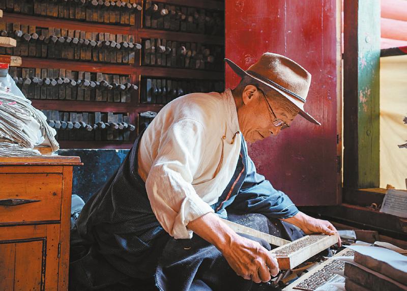 ③8月28日,甘孜州德格县德格印经院,69岁的彭措泽仁在校对修复雕版。作为德格印经院藏族雕版印刷技艺的代表性传承人,他已从事这项工作40余年。