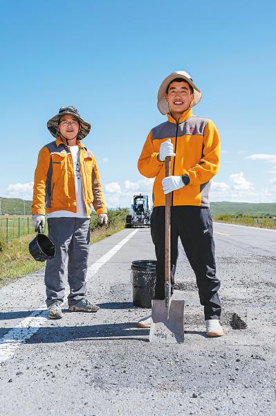 ⑤8月12日,24岁的尼玛木滚(前)是阿坝州公路管理局刷经寺公路管理分局的职工,2021年大学毕业后成为一名养路工。他与工作了17年的同事吴顺杰一起,负责管护约40公里的国道。