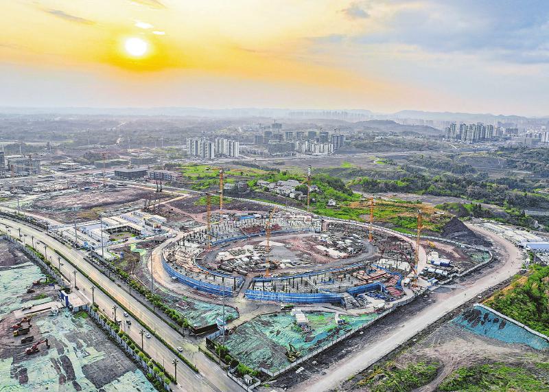 9月23日,鸟瞰广安市广安区官盛新区正在加紧建设的川渝广安共享体育基地工程“奥体中心”。拟作为2026年四川省运动会比赛场馆之一的川渝广安共享体育基地工程“奥体中心”集体育场、体育馆、游泳跳水馆、综合训练馆等为一体,建成后可承担大型运动会开幕式和田径、游泳等比赛项目,还可承接国际国内大型体育赛事和文艺活动。 邱海鹰 摄(C视觉)