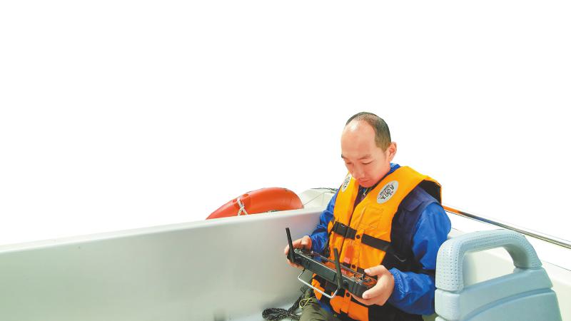 阿坝水文中心工作人员操作搭载多波束测深仪的无人船进行测量作业。