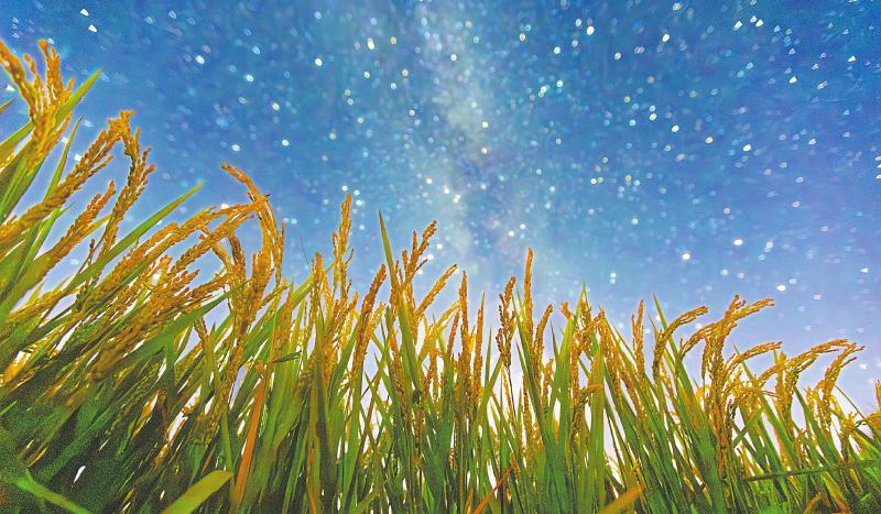 近日在黑龙江省汤原县吉祥乡互胜村拍摄的星空下的稻田。丰收时节,黑龙江省各地稻菽飘香,金黄遍野。夜幕降临,“北大仓”更显静谧丰腴,一幅丰收画卷在星光下徐徐展开。新华社发(朱宗强 摄)