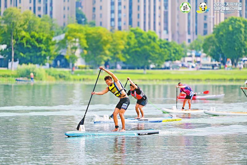 近日,2024年天府绿道SUP桨板公开赛比赛现场。
