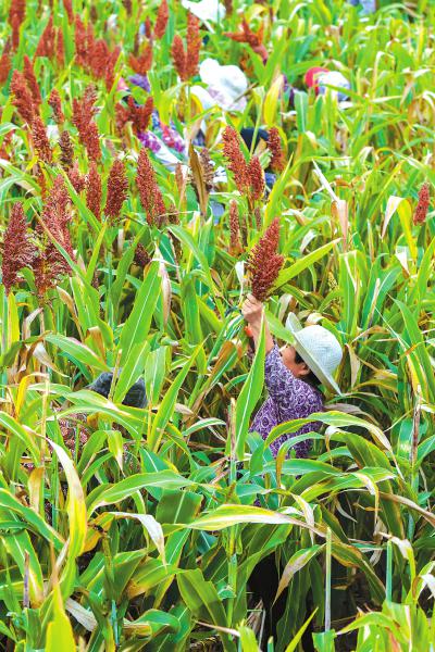 近日,平昌县南天门旅游景区管理委员会红山村粮油示范基地的酒用高粱成熟,村民趁着晴好天气抢收高粱。 张书浩 摄