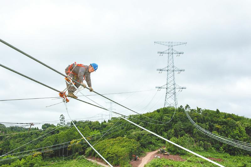 在川渝特高压工程22标段施工现场,电力工人正在安装卡线器。 安伟 摄