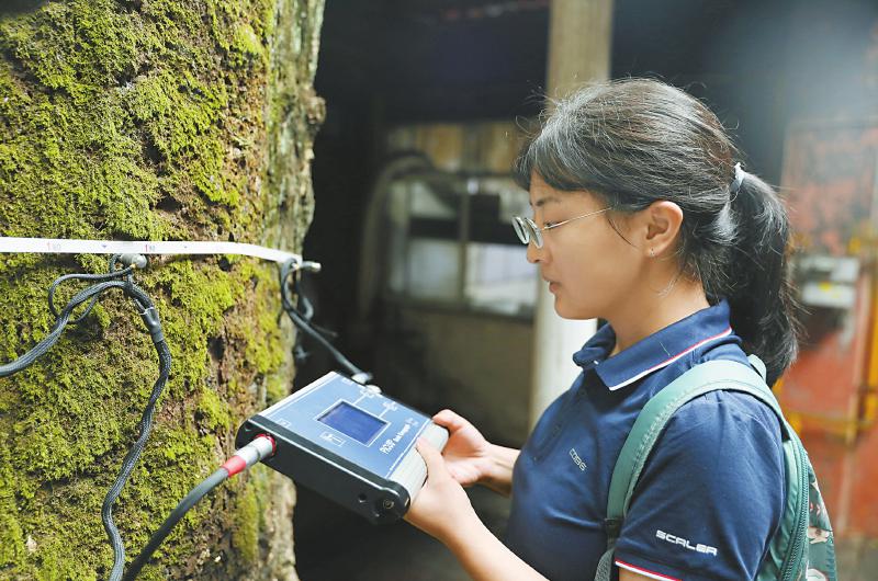 “古树医生”正用仪器检测古树周围土壤紧实度。