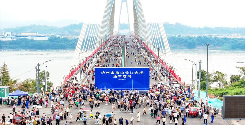 9月26日上午,泸州市榕山长江大桥建成投用,当地群众拥上桥面用传统“踩桥”方式庆祝大桥通车。 李贵平 摄(C视觉)
