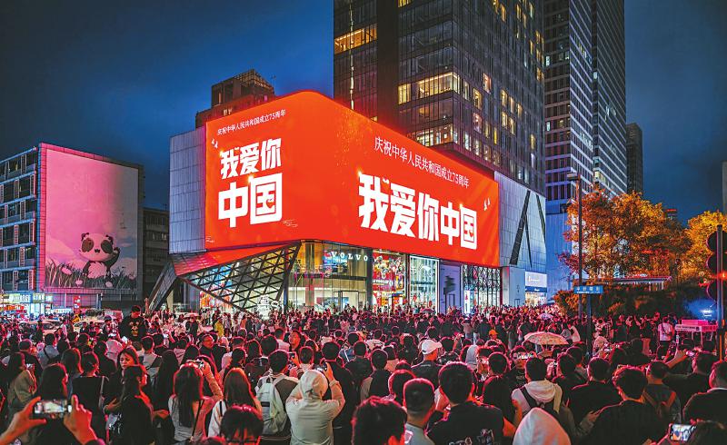 国庆假期,成都市春熙路商圈人流如织,许多游客慕名前来,打卡网红景点裸眼3D大屏。张翔升摄(视觉)