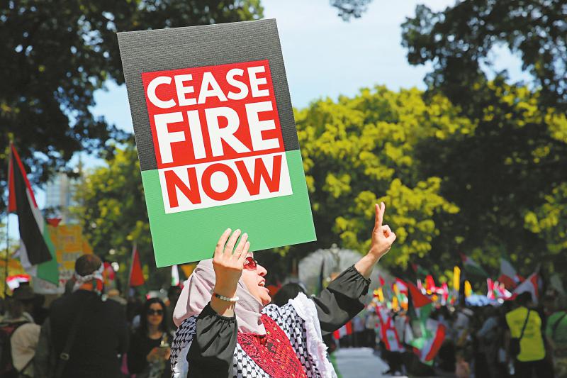 10月6日,在澳大利亚悉尼市中心,民众参加声援巴勒斯坦和黎巴嫩游行。新一轮巴以冲突已持续整整一年。近日,全球多地民众走上街头,要求尽快结束在巴勒斯坦加沙地带等中东地区的战事,尽快结束人道主义危机。 新华社记者 梁有昶 摄