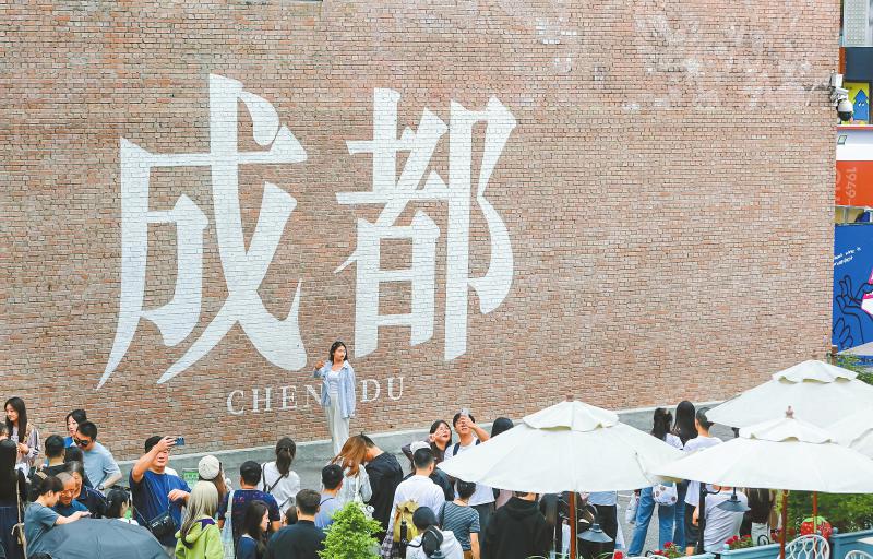 国庆假期,成都东郊记忆景区内,游客在地标建筑前打卡。 李勇 摄(C视觉)