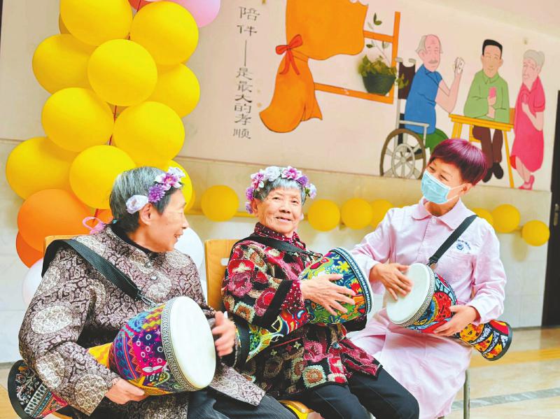 资阳市社会福利院的老人和护理员在一起表演节目。