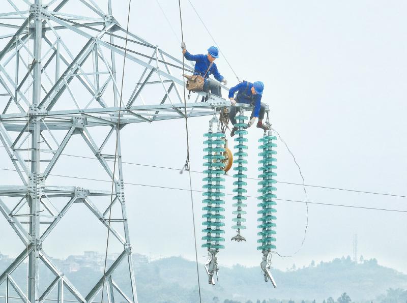 10月10日,国网自贡供电公司员工 在 新 组 立 的220kV向园南线12号铁塔上安装悬瓶,为下一步导线施放做准备。据悉,220kV向园南、北线的改迁,将服务自贡东部新城发展。袁丹 摄