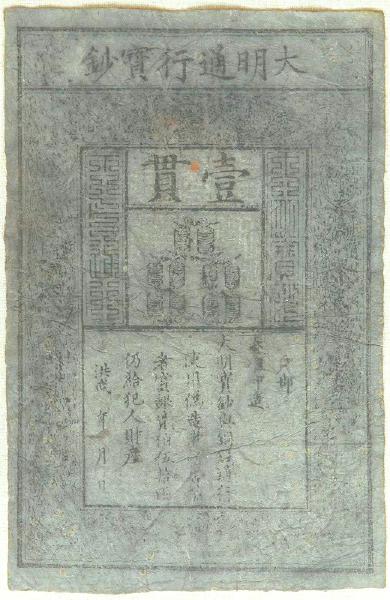 明朝曾发行纸币“大明宝钞”。图为大明通行宝钞。 图片来自中国国家博物馆官网