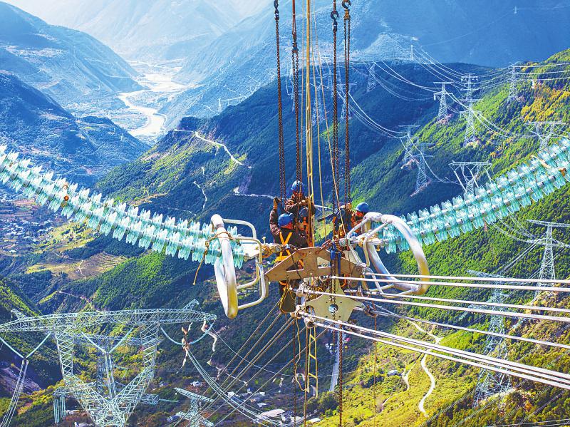 10月18日,在甘孜州泸定县甘谷地村附近的1000千伏川渝特高压交流工程8标段施工现场,电网施工人员正在高空开展紧线作业。目前,由国网四川省电力公司建设管理的该工程四川段已进入冲刺阶段。 田海 摄(C视觉)