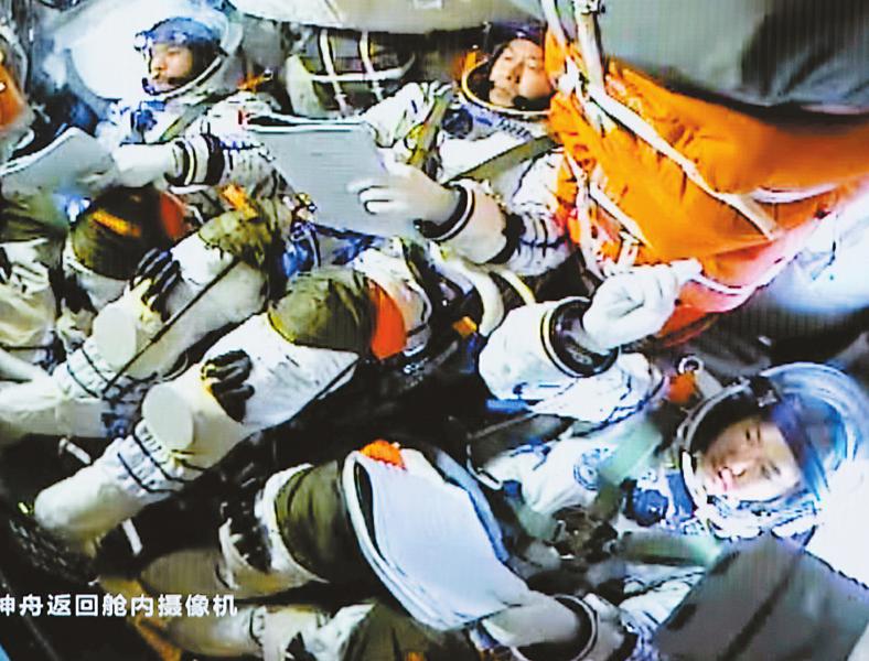10月30日在北京航天飞行控制中心拍摄的神舟十九号航天员乘组和神舟十八号航天员乘组交流的画面。新华社发