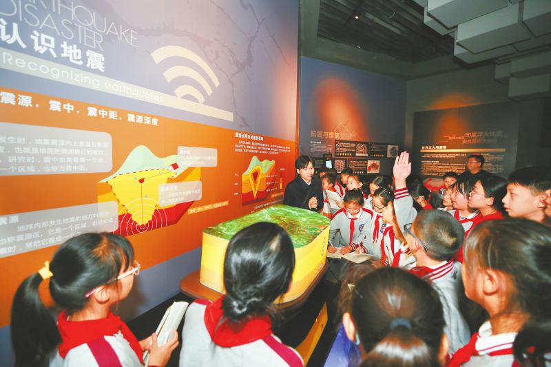 在四川省防灾减灾教育馆开展的应急科普活动中,小学生学习地震科普知识。 应急管理厅供图