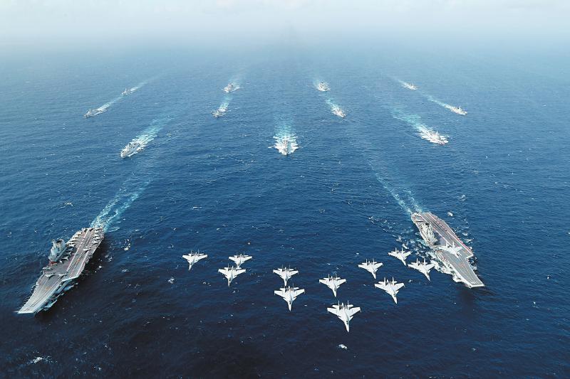 10月下旬,海军辽宁舰编队开展远海实战化训练。期间,辽宁舰、山东舰编队首次开展双航母编队演练。