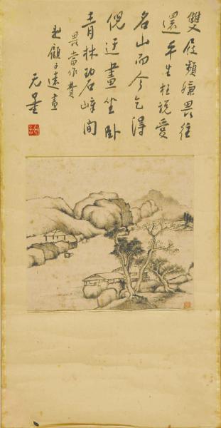《山水图诗》轴,[清]顾复初画、谢无量作诗并书。