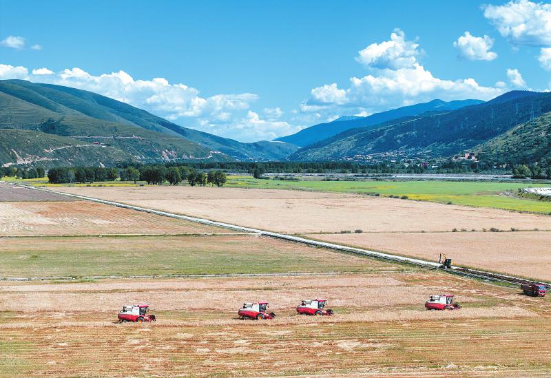 8月21日,甘孜州炉霍县虾拉沱镇若海村,联合收割机正在收割青稞。