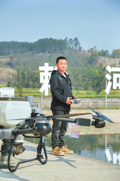 3月21日,自贡市荣县观山镇明久水稻种植家庭农场负责人徐世雄正在操作无人机给小龙虾精准投撒饲料。