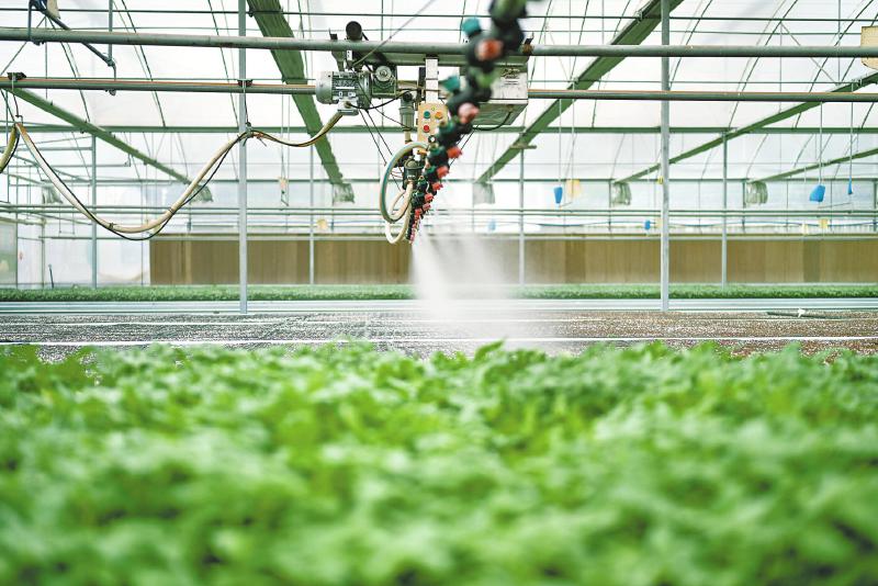 绿怡果蔬种植专业合作社“育苗工厂”里的自动化喷淋系统每天定时为西红柿幼苗浇水。