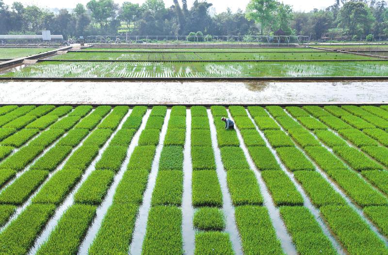 4月12日,科研人员在四川省农业科学院水稻高粱研究所泸县科研试验基地田间种下的近万份水稻新材料中,优中选优培育超级水稻品种。