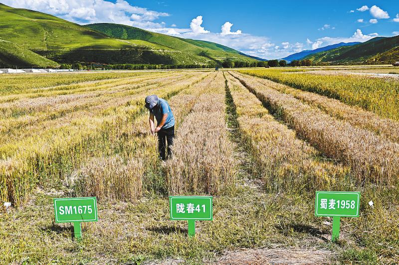 8月21日,甘孜州炉霍县农牧局种子管理站站长屈斌在试验田中观察青稞新材料的生长情况。