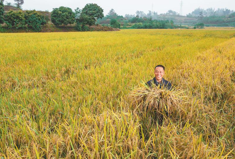 10月10日,泸州市泸县潮河镇五谷寺村再生稻种植大户何用展示收割的再生稻。