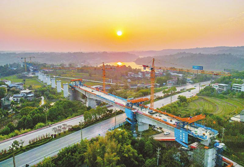 11月3日凌晨,随着最后一方混凝土浇筑完成,由中铁十局西渝高铁一分部承建的广安市华蓥段清溪口特大桥跨广华大道80米连续梁顺利合龙。这是西渝高铁华蓥段首个连续梁合龙。图为11月2日拍摄的即将合龙的跨广华大道清溪口特大桥。 邱海鹰 摄(C视觉)