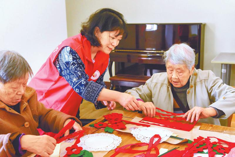 四川老年大学开展“岁月留痕 匠心传承”手工剪纸活动,银龄志愿者陪同高龄老人学习剪纸。