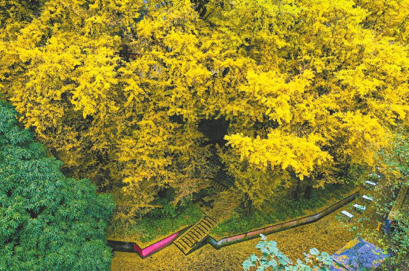 10月29日,雅安市名山区蒙顶山,古银杏群“蒙顶十二钗”已收起绿荫,即将“金甲”满身,呈现一年中最美丽浪漫的色彩。