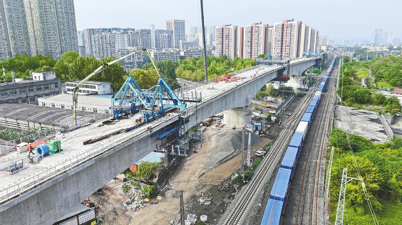 11月5日,成渝中线高铁动走线跨沙河特大桥连续浇梁实现合龙。中铁八局供图