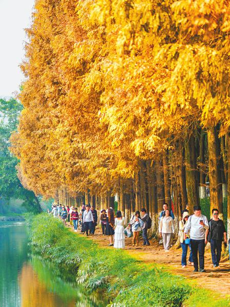 近日,成都市升仙湖公园内的水杉林迎来最佳观赏时节,不少市民前来打卡,用相机、手机记录下这金黄色的美景。 刘耀飞 摄(C视觉)