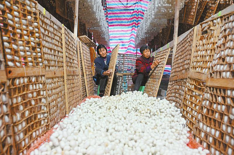 11月11日,内江市东兴区双桥镇双流村贾伟桑蚕药材家庭农场,蚕农在采收最后一批晚秋蚕茧。近年来,东兴区坚持发展特色产业,采取“公司+合作社+基地+农户”模式大力发展蚕桑产业,通过推广良种良法实现一年九批次养殖,有效促进农民增收,助力乡村振兴。 兰自涛 摄(C视觉)