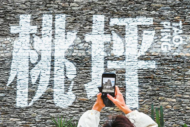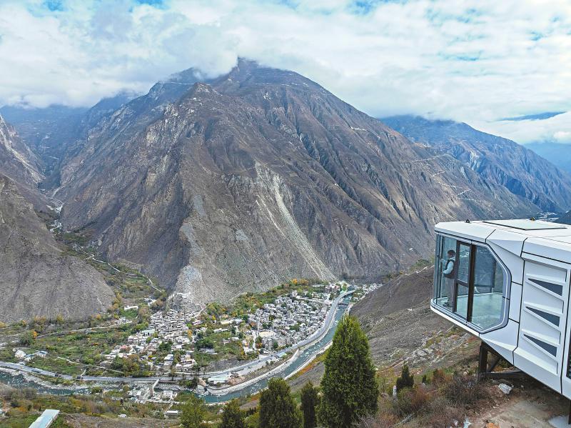 11月18日,在桃坪村对面山顶的水果采摘基地,新建的太空舱引来游客拍照打卡。
