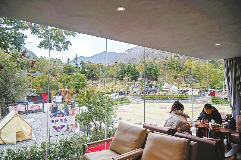 11月18日,游客在桃坪村村口的羌调咖啡店中休憩。