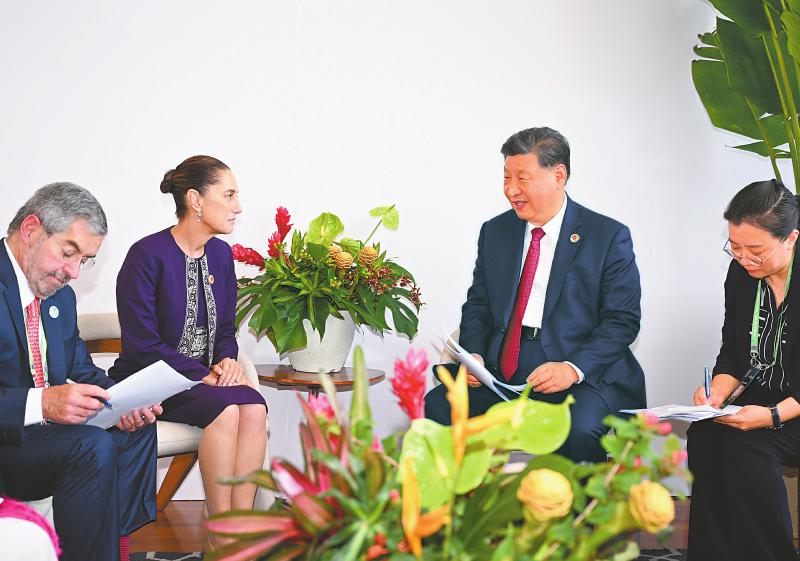 当地时间11月18日下午,国家主席习近平在里约热内卢出席二十国集团领导人峰会期间会见墨西哥总统辛鲍姆。 新华社记者 李学仁 摄