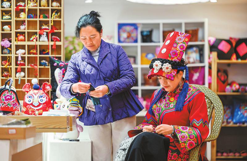 11月18日,桃坪村“桃坪羌绣馆”中,羌绣州级代表性传承人张居悦(右)正在绣制羌绣。