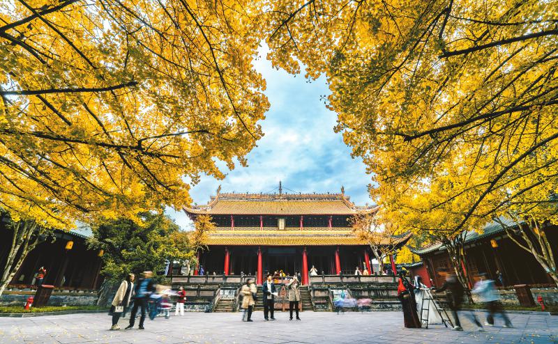 11月16日,崇州市罨画池博物馆内的两棵银杏树已进入最佳观赏期。金黄的银杏叶与红墙黄瓦交相辉映,构成一幅绝美的秋日画卷,吸引了众多游客前来打卡。 李旭 摄(C视觉)
