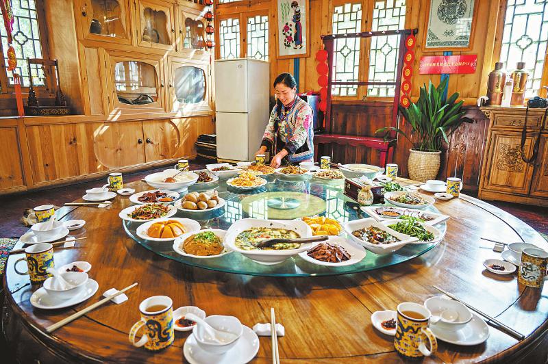 11月18日,桃坪村桃坪羌寨尔玛人家农家乐的工作人员正为游客准备羌族特色餐。