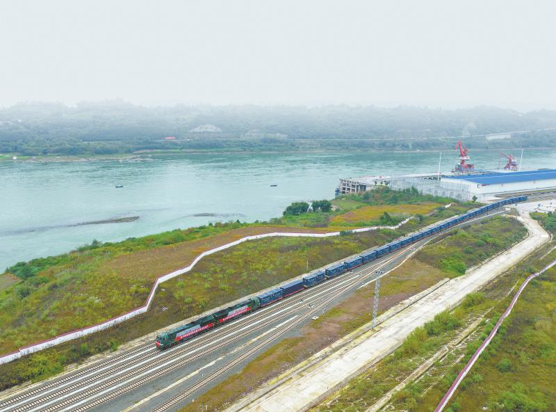 11月19日,位于宜宾三江新区的宜宾港散货码头,一列搭载动力锂电池的列车正驶离码头(无人机照片)。 庄歌尔 摄(C视觉)