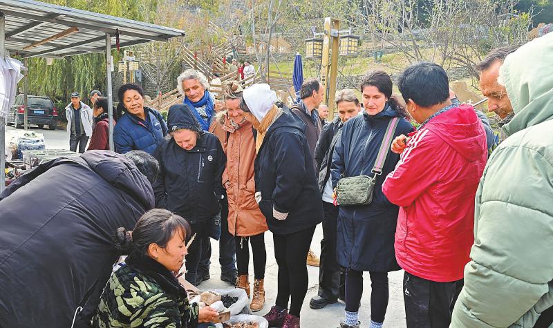 11月16日,桃坪村迎来了一批外国游客,他们对村民销售的当地特色农产品很感兴趣。