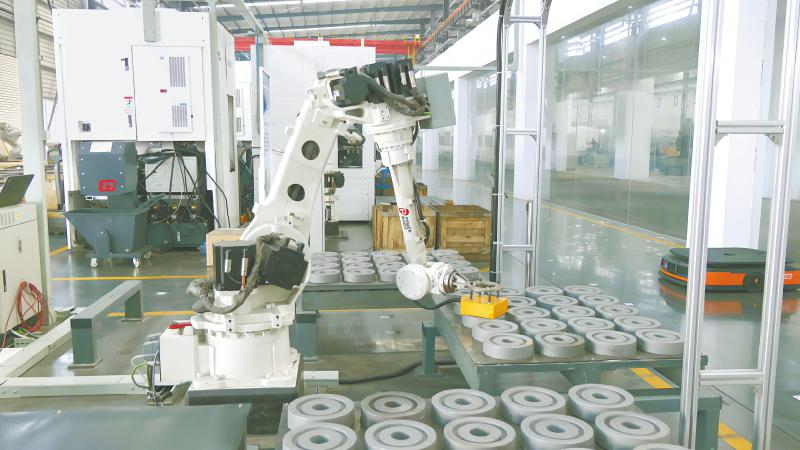 四川德恩精工科技股份有限公司的数智化车间,企业自主研发的工业机器人熟练进行作业。 青神县委宣传部供图