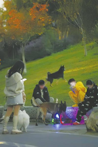 11月20日晚,记者在成都市成华区方家河公园看到,在草地上奔跑的犬只没有牵绳。四川日报全媒体记者 卢春阳 摄