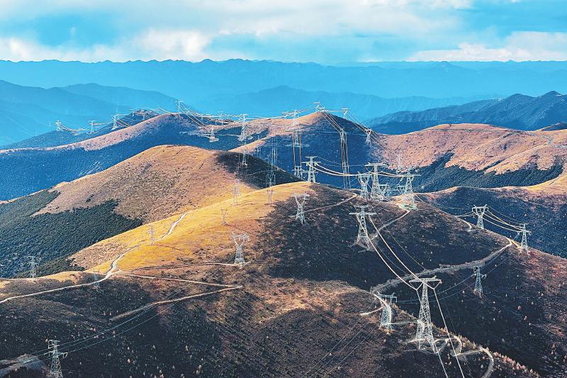 11月21日,在康定新都桥高尔寺金上—湖北± 800千伏特高压直流输电工程施工现场,电力线路普遍位于海拔达4000米以上的山脊上。金上—湖北±800千伏特高压直流输电工程是首个进入川藏高原腹地的特高压直流输电工程,送端汇集金沙江上游的水电和新能源,受端接入华中特高压交流骨干网架,途经西藏、四川、重庆、湖北,全长1901公里。 杨东川 摄(C视觉)