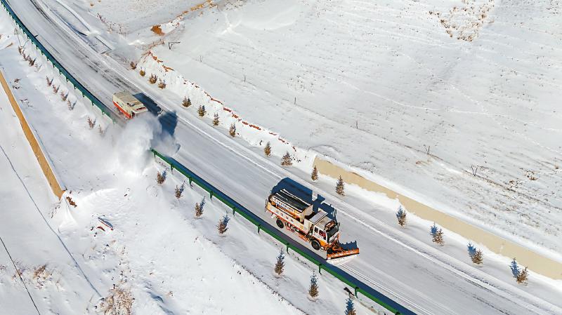 11月25日,工作人员驾驶除雪设备,在甘肃肃南裕固族自治县境内的国道上开展除雪防滑保畅作业(无人机照片)。