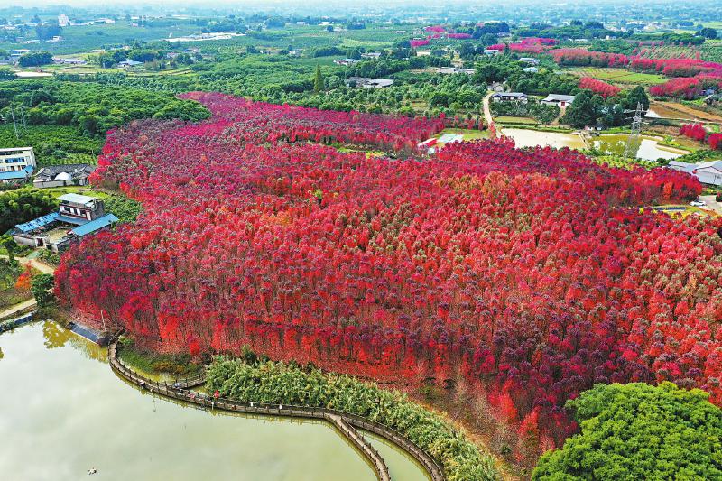 11月25日,眉山市东坡区太和镇元宝村亿嘉林木基地600多亩的“夕阳红”和“红冠”红枫迎来最佳观赏期,吸引游客前来观赏。近年来,东坡区大力发展生态休闲观光农业和乡村旅游,因地制宜打造多个农旅融合综合体,为游客提供观光、休闲、教育等多种服务,带动当地群众多渠道致富。 张忠苹 摄(C视觉)