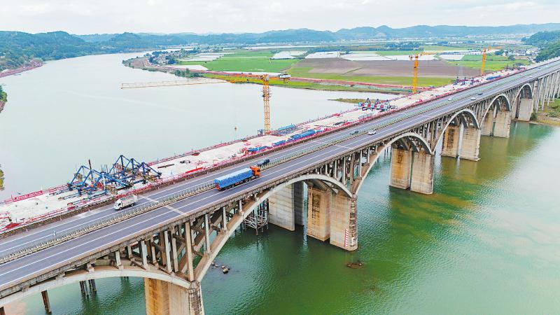 近日,成南高速扩容工程项目新建桂花涪江特大桥主桥顺利合龙,为2025年全线建成通车奠定坚实基础。该特大桥跨越涪江和247国道,全长1.26公里,是为缓解成南高速公路通行压力在既有老桥右侧新建的桥梁,主桥长666.8米,设计时速100公里。 吴奉家 摄(C视觉)