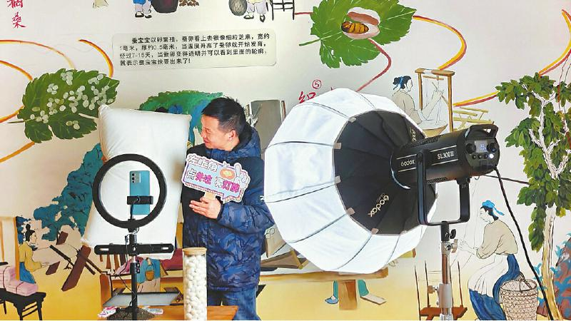 近日,富顺县飞龙镇真觉村,谭松正在“谭小谭的杂货铺”直播卖蚕砂枕。 富顺县委组织部供图