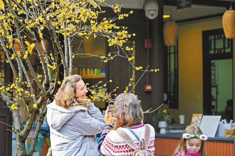 1月4日,成都市杜甫草堂里腊梅花开,暗香浮动,中外游客在文化圣地享受着冬日美好时光。