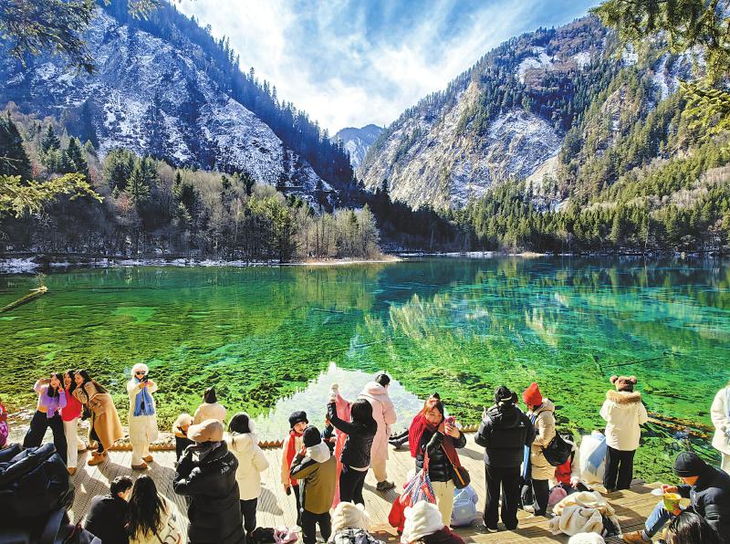1月12日,阿坝州九寨沟景区渐入“冰雪佳境”,中外游客纷纷在九寨沟五花海打卡。